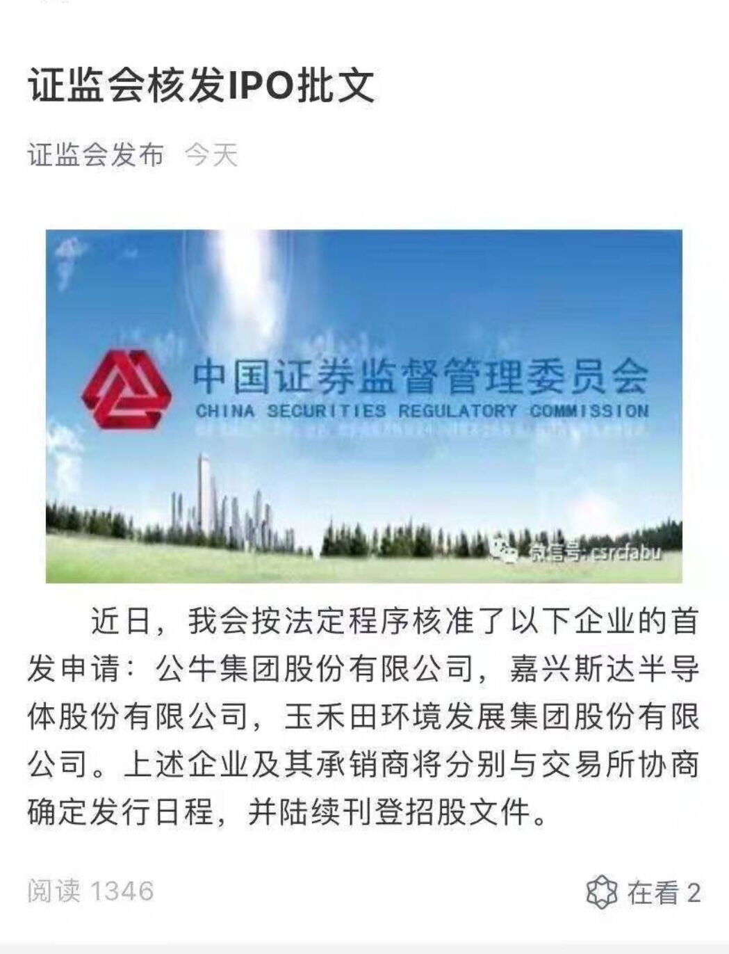 1月3日,證監(jiān)會(huì)發(fā)布消息:近日,我會(huì)按法定程序核準(zhǔn)了以下企業(yè)的首發(fā)申請:公牛集團(tuán)股份有限公司,嘉興斯達(dá)半導(dǎo)體股份有限公司,玉禾田環(huán)境發(fā)展集團(tuán)股份有限公司。上述企業(yè)及其承銷商將分別與交易所協(xié)商確定發(fā)行日程,并陸續(xù)刊登招股文件。