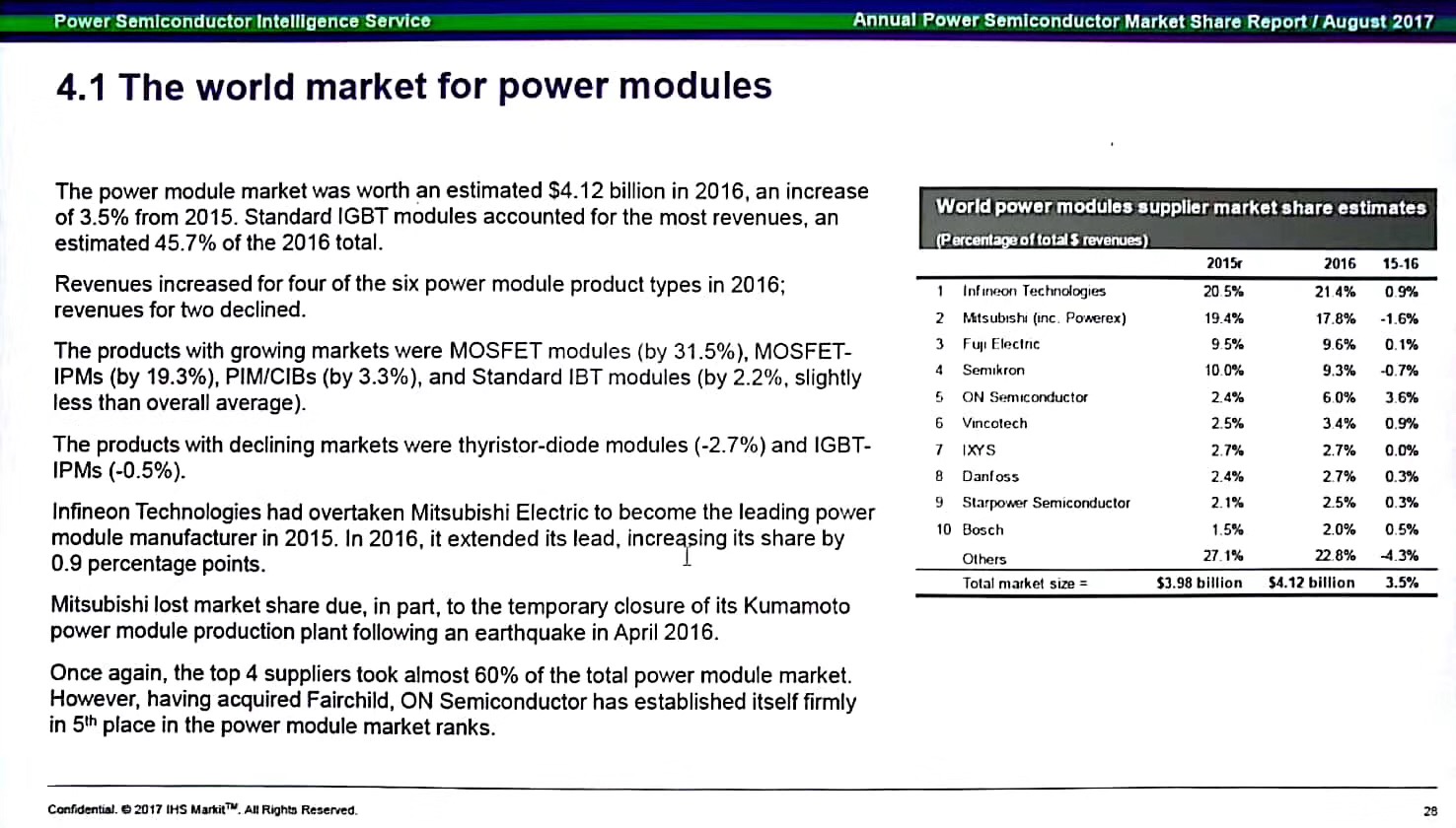 斯達首次進入全球功率模塊市場排名前十,2016年位列第九