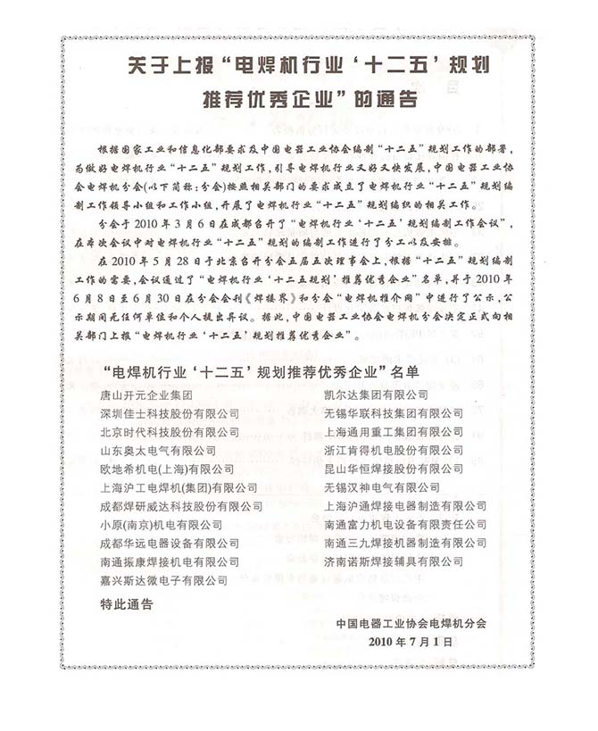 嘉興斯達被推薦為“電焊機行業(yè)‘十二五’規(guī)劃優(yōu)秀企業(yè)”